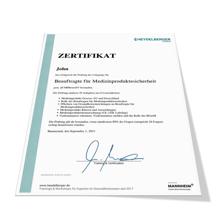 Nach automatisierter Auswertung des Prüfungsbogens erhalten Sie direkt nach Abschluss das Ergebnis mitgeteilt. Bei bestandener Prüfung stellen wir Ihnen ein personalisiertes Zertifikat (PDF) zum „Beauftragten für Medizinproduktesicherheit gemäß § 6 MPBetreibV“ aus. Dieses Zertifikat dient als rechtskonformer Nachweis Ihrer Befähigung gegenüber Aufsichtsbehörden, internen QM-Systemen und externen Stellen. Das Zertifikat wird an die von Ihnen im Prüfungsbogen angegebene E-Mail-Adresse versendet.
